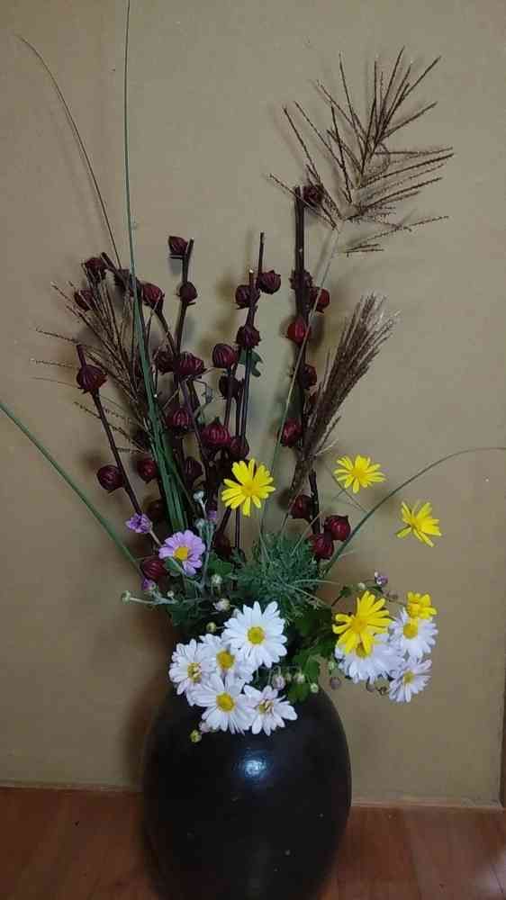 我が家で集めたスプレーマム、ユリオプスデージーと野生の薄の穂と生けました。