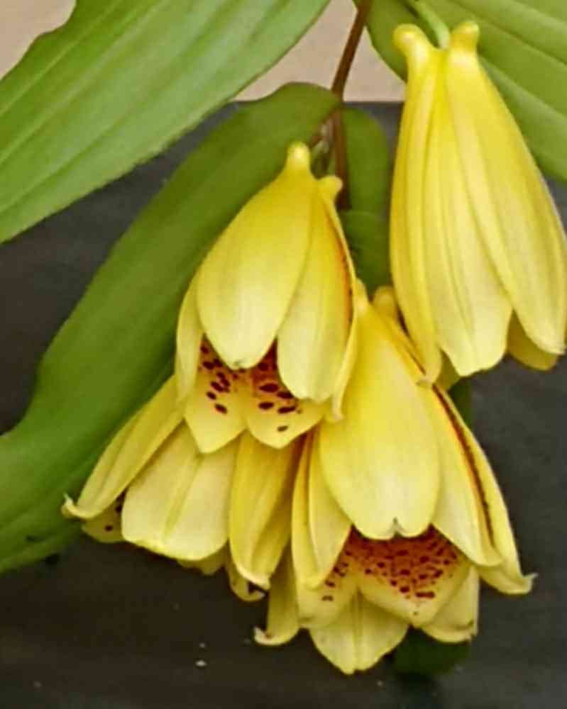 黄色い釣り鐘形で内側に赤紫色の斑点