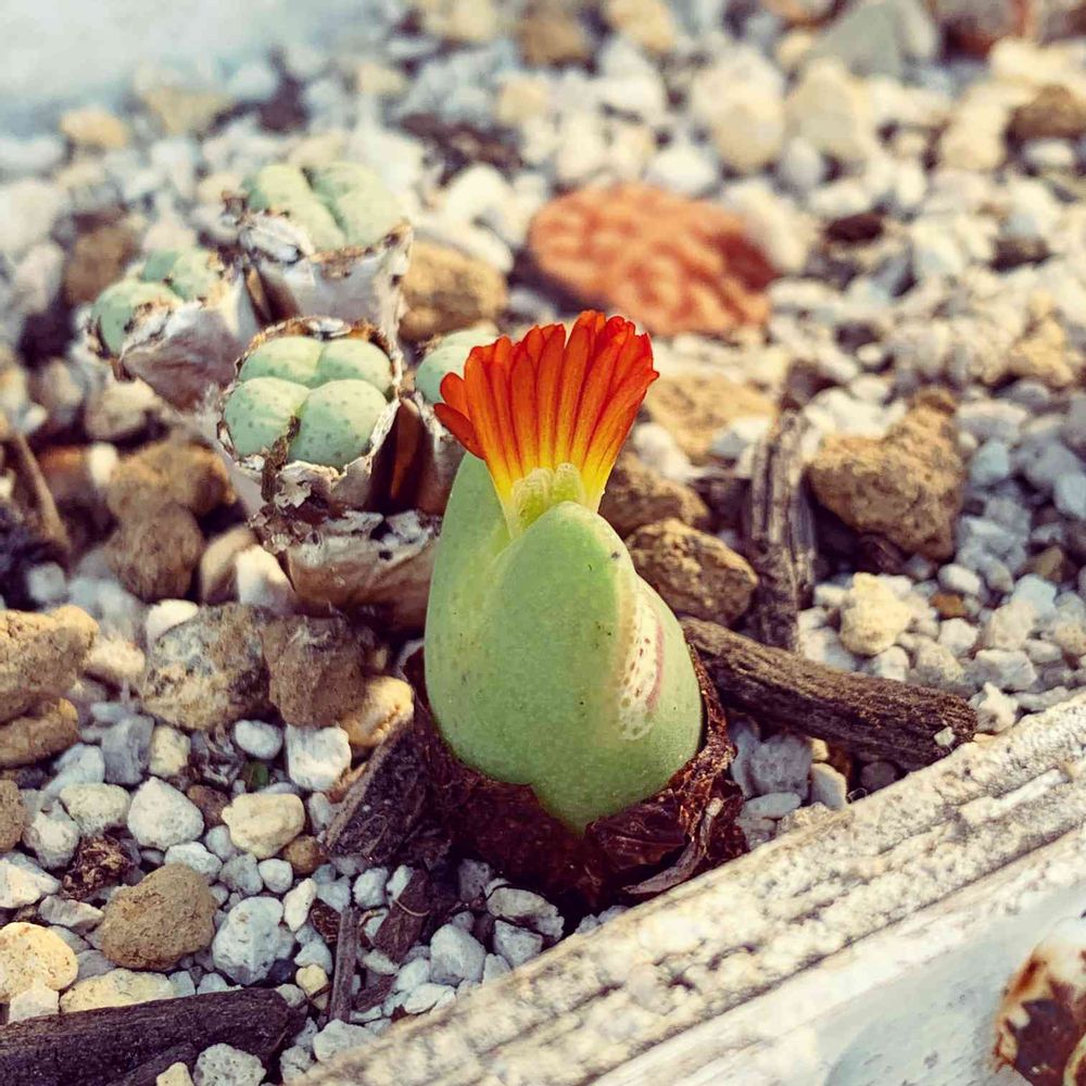 一年以上育てていて、最近脱皮して、この度初めての花をつけたコノフィツム(品種不明)。