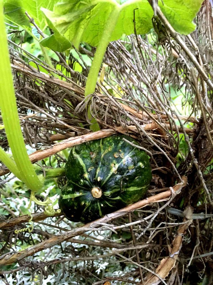木立性のラベンダーの枝に挟まって、坊ちゃん南瓜が大きくなろうとしてたんだ!∑(゚Д゚)