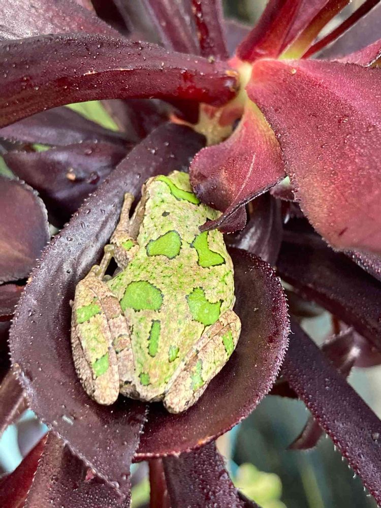 葉の模様かと思ったらびっくりカエル🐸さん。凄い模様ですね〜初めて見ました。