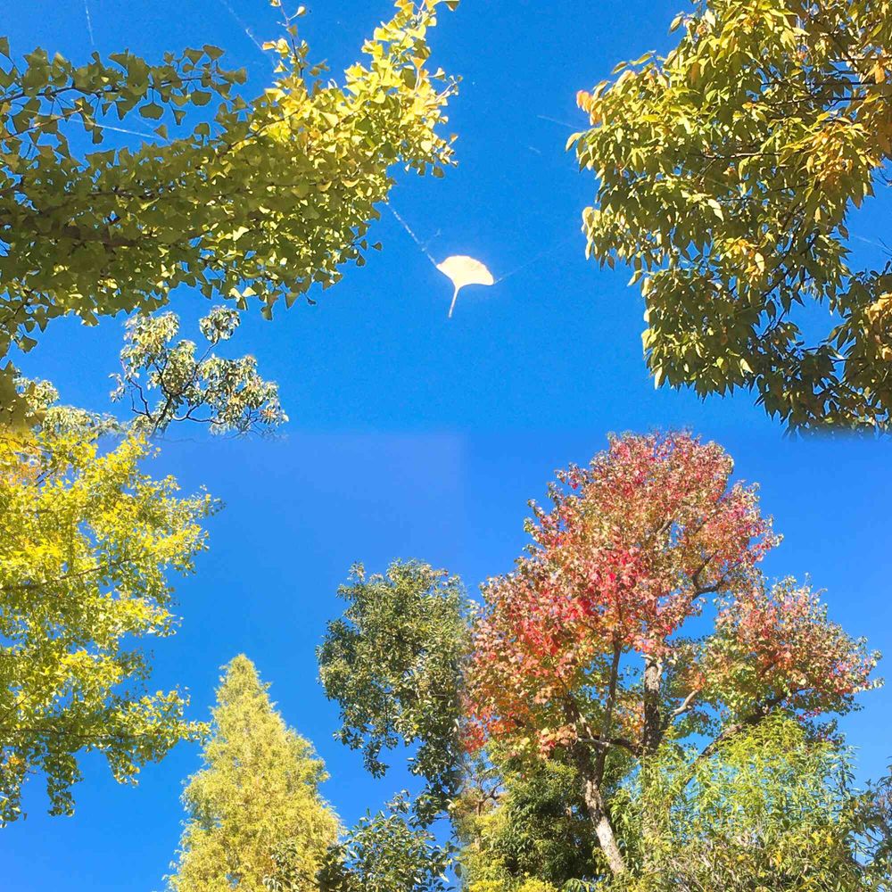 青空の色が凄いですね。紅葉が映えます🍁 イチョウが上空遥か高くに上がってるたこ🪁に見えます🤗