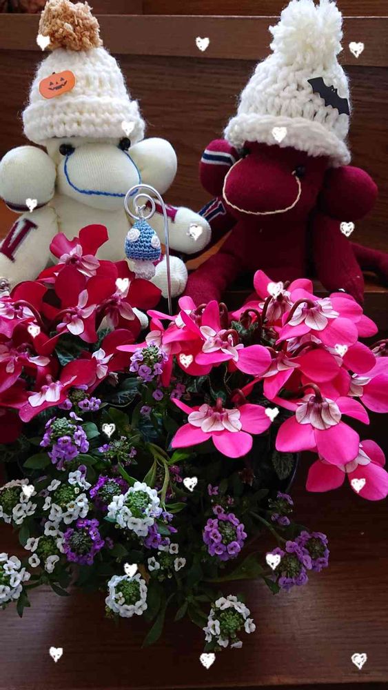 可愛いシクラメン?とアリッサムとの撮影でソクモンちゃんが可愛く写っているよ💖