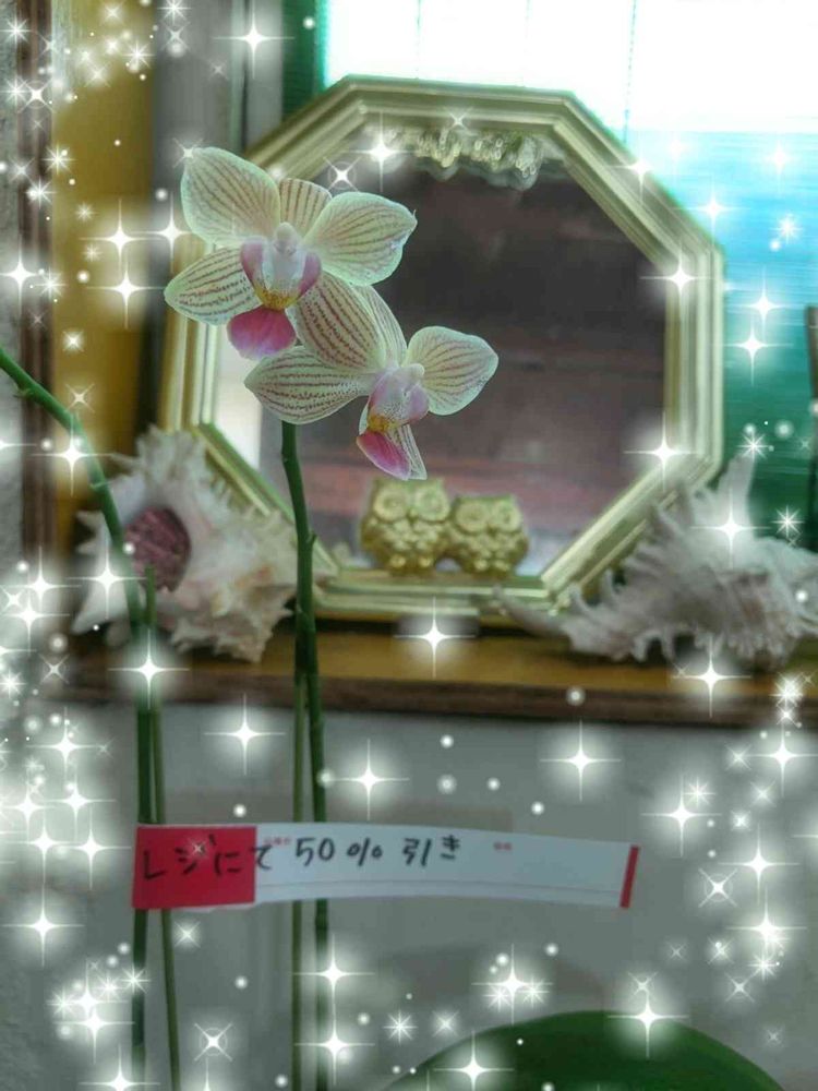家にあるフクロウ鏡と一緒に…最近半値(←強調( *^艸^))でお迎えしたミニ胡蝶蘭🌺✨