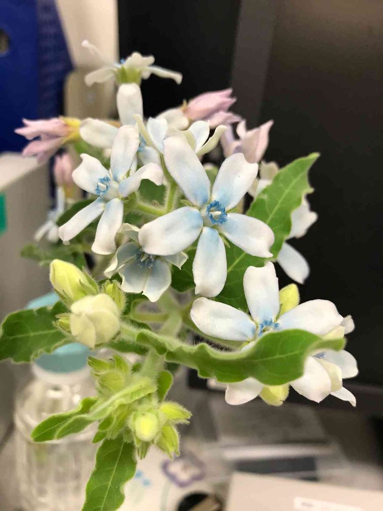 買った時は水色が濃かったのですが、徐々に薄い水色になって、萎んだ時は薄ピンクになりました。色の変化も楽しめるお花です(﹡´◡`﹡ )
