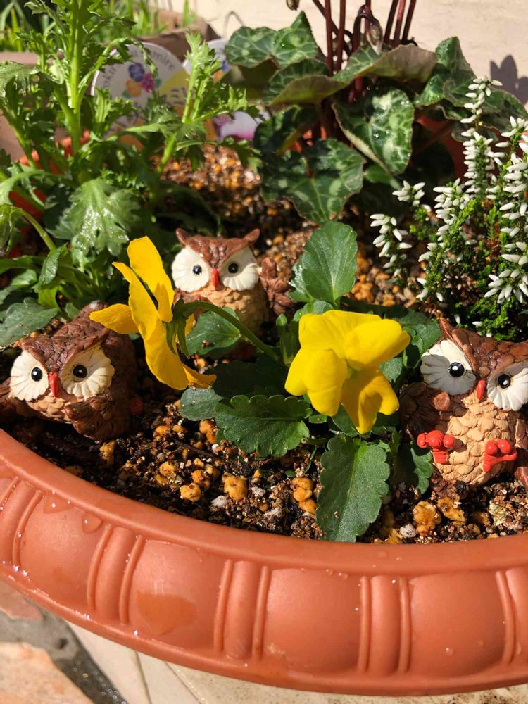 くろすけさん、3羽のフクロウちゃんと寄植えの可愛いお花の写真ですね💕