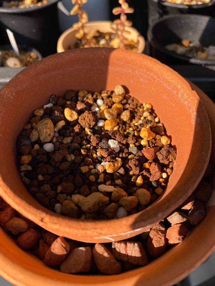 鉢内を4分割し左上中心辺りにチョコっと顔を出してます。