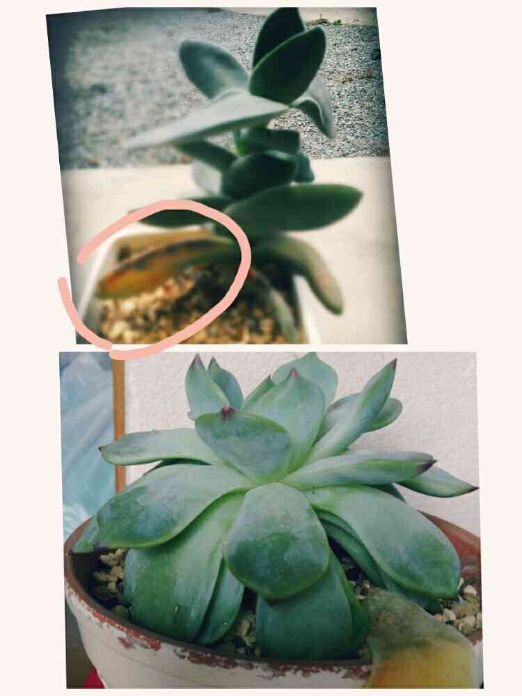 多肉植物初心者の私を助けて下さい😨 ①上の神刃の下葉が茶色に変色…硬いはずの葉がグテグテです💦上の葉はまだ元気 ②下の子はチワワエンシス?下葉がグッタリ