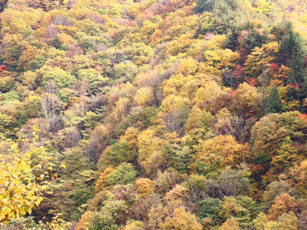 六方沢からカメラを向けた先には、山肌を覆う色とりどりの美しい木々🌳.・*・.🍁