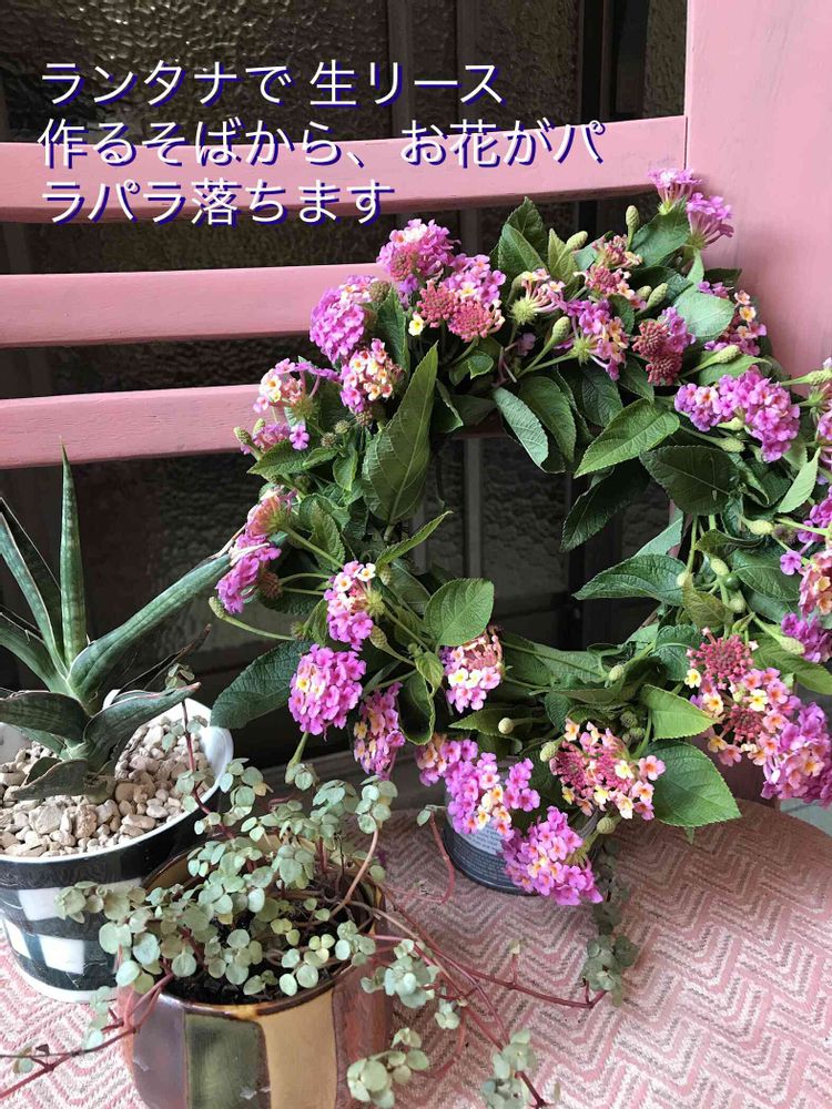 大きくなり過ぎて、お邪魔になってきたランタナをカットして リースを作りました。