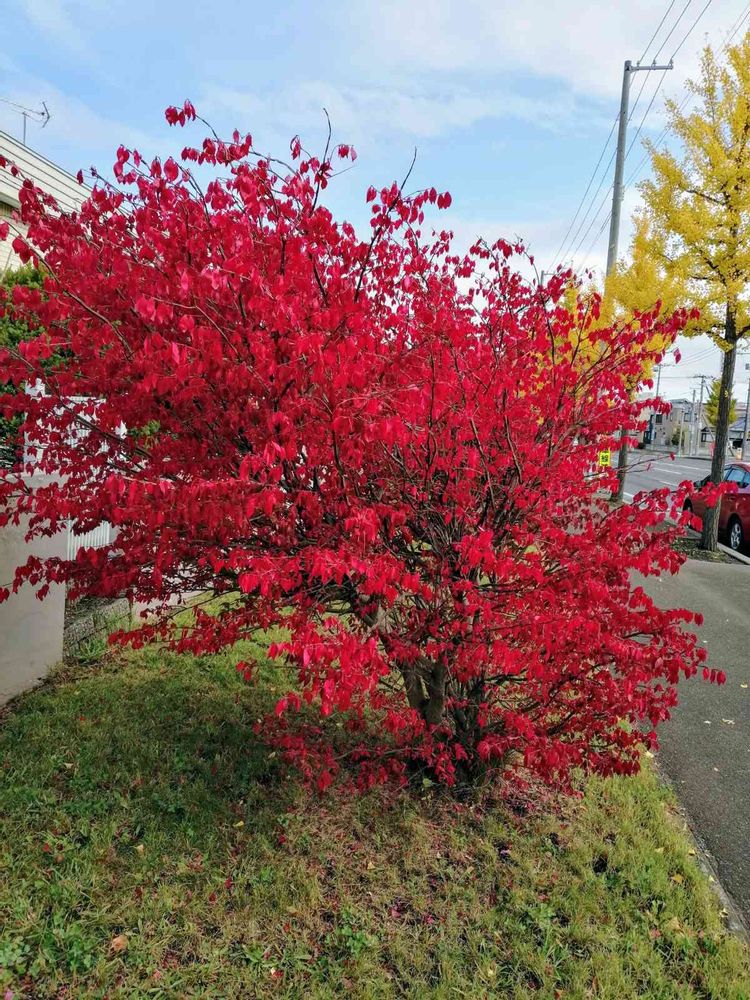 路側帯に植えられた、ニシキギの紅葉が綺麗ですねー。😆
