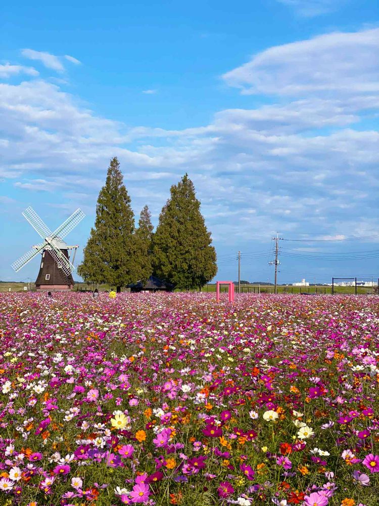 とっても綺麗ですね😃青空とコスモス、そして風車小屋。癒されました❣️