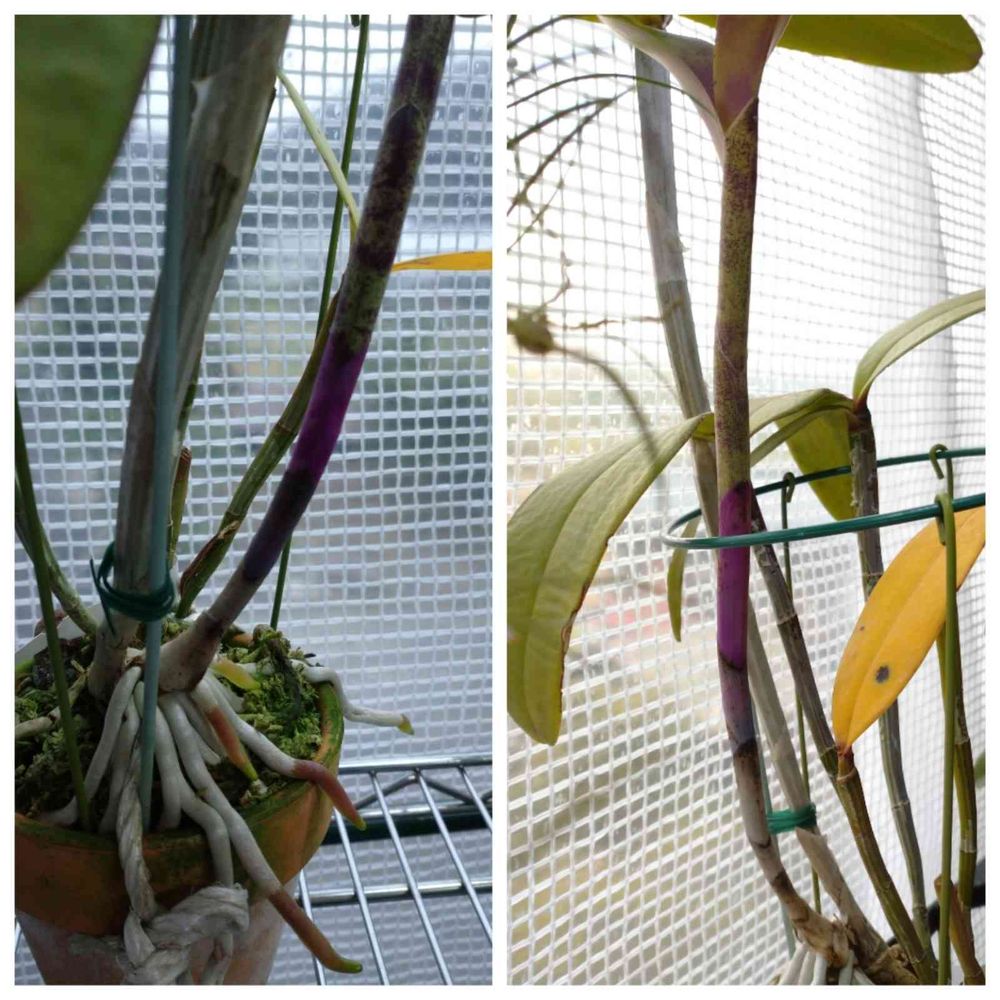 ある日カトレア グッタータのバルブの付け根が3〜4cmの紫色に染まりました💜