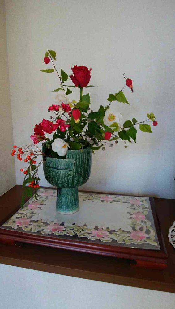 お庭のお花と一緒に生けました😊色づいてきたナナカマドの実