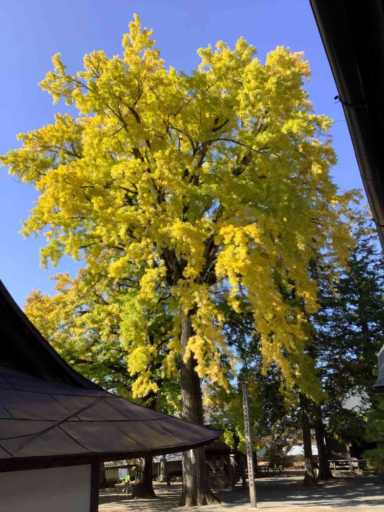 周囲(目の高さの幹回り)約4メートル30センチ、高さ約40メートルの大ギンナンは「子授け」の御利益があるとして親しまれているそうです。