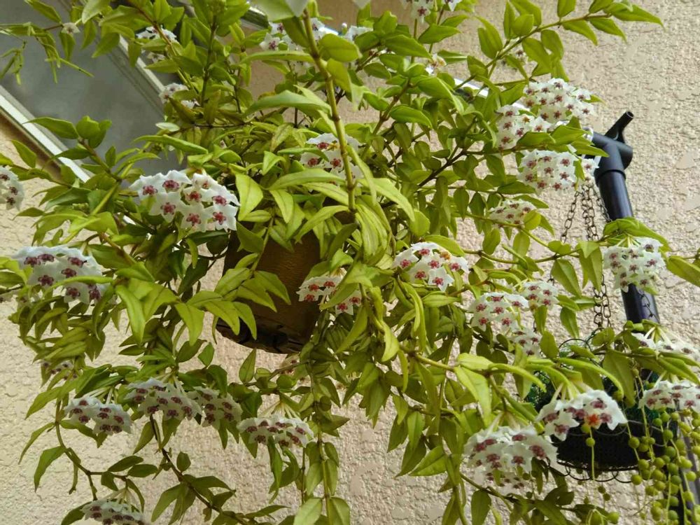 サクラランの花が沢山さいたが花が下に垂れ下がり高い所にぶらさげないとだめなのよ