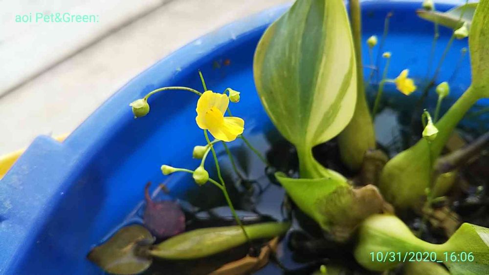 斑入りホテイ草を浮かせているバケツの中に、黄色い小さな花が咲き始めまして…
