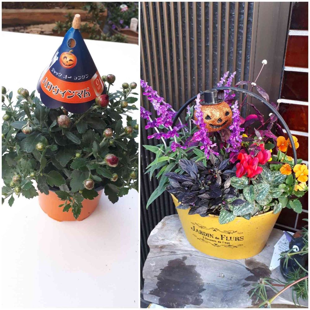 ハッピーハロウィン🎃🧙♀️👻✨🌕✨市販の寄せ植え、可愛らしいポットマム買っちゃいました。(*^^*)💜❤💛