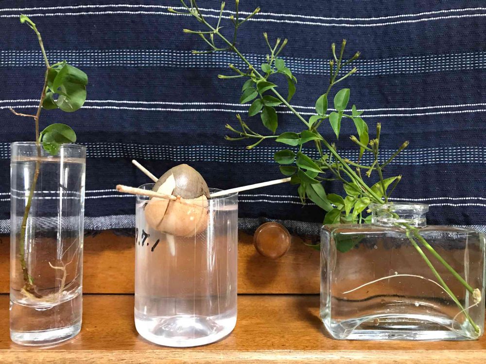 この後上から芽がでて葉っぱが出るまでずっと水栽培してるのですが、土に植えるタイミングが難しいです。もう2年越しの子は今葉っぱが12枚になりました。やはり土に植えてあげると成長早いみたい。