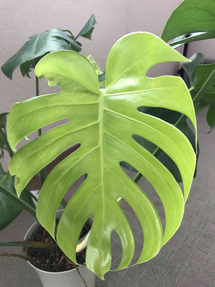 モンステラの新しい葉が開ききりました〜。左側にキズや切れがありますが👀、それでもつやつやです。✨良く頑張ったね!
