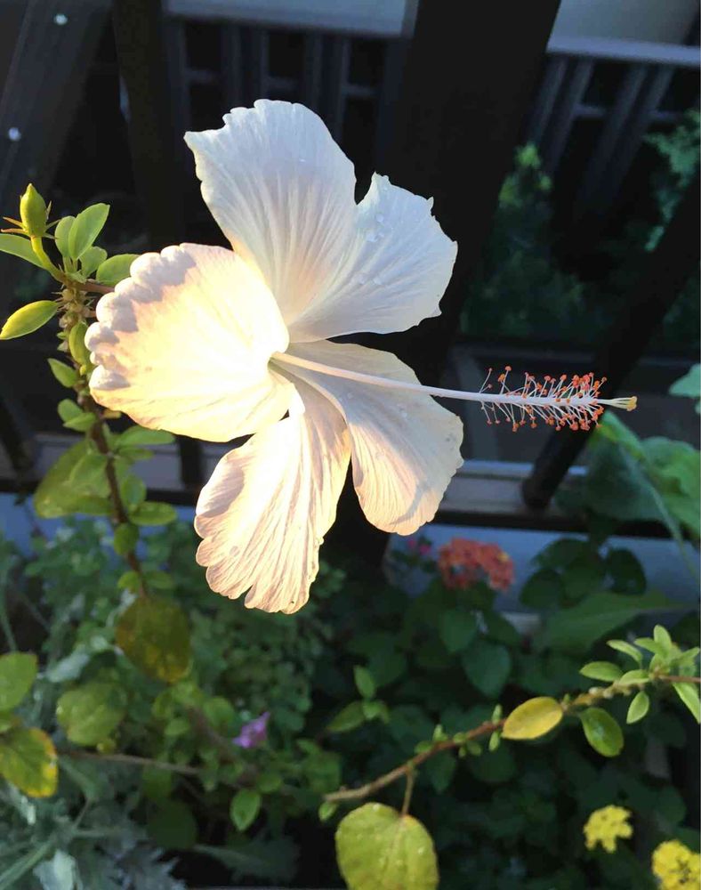 ハイビスカス・ホワイトバタフライ 背中から朝日を浴びてます💕
