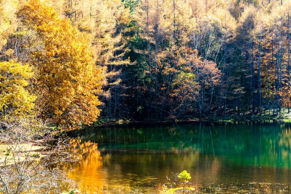 黄色く紅葉した木々とエメラルドグリーンの水の色💚