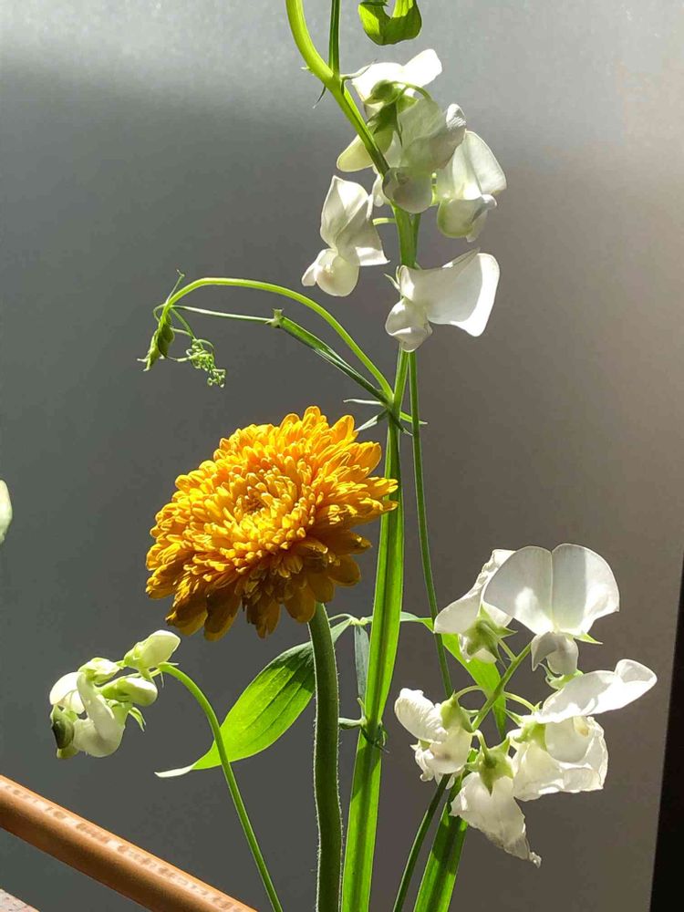 (サマースイートピー)とガーベラです。ビタミンカラーで今月も頑張りましょう。