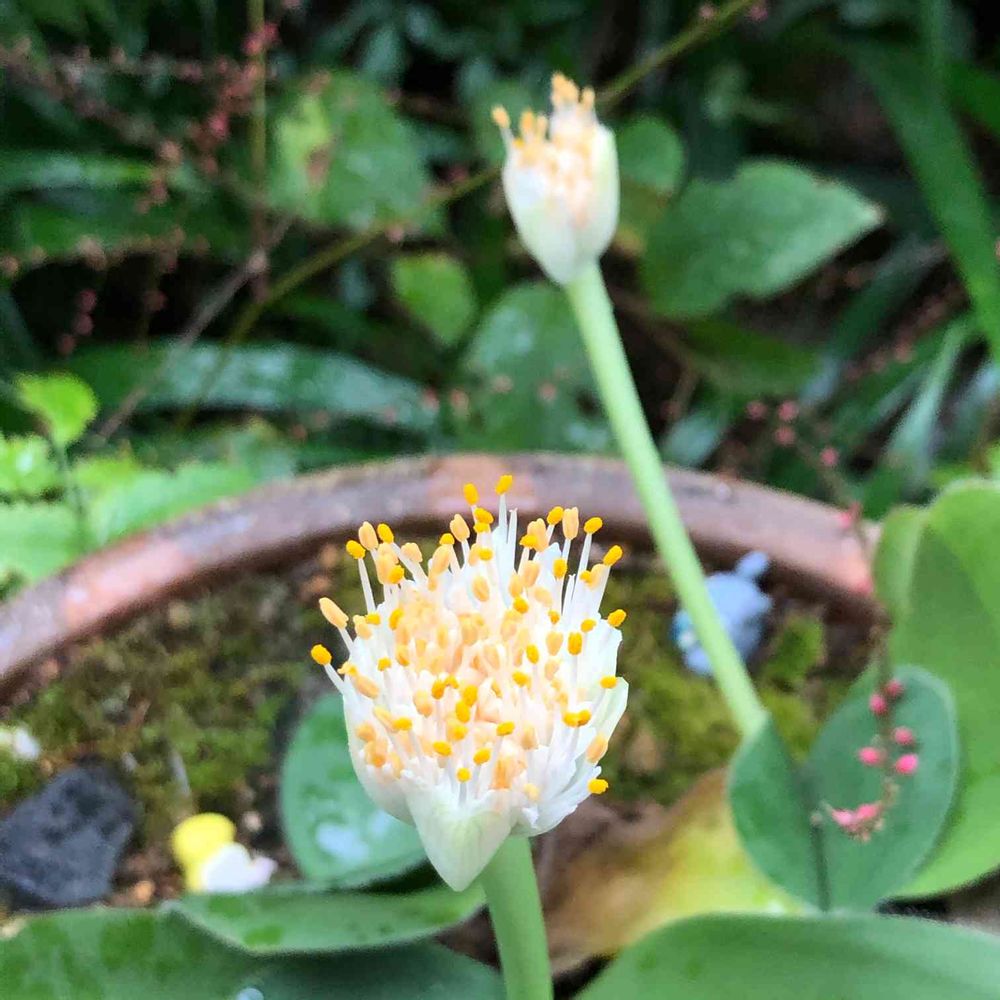 毎年10月に2枚の葉の間から花芽を伸ばして咲きます。眉刷毛に似ているかららしいです。幾つつぼみがあるかなぁと、葉の間をのぞいてしまいます。今年は11 個でした。