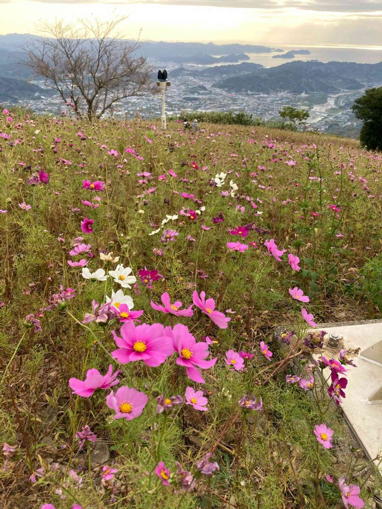 標高586mから見下ろす海がとても綺麗でした。コスモスはちょっと残念な事になってましたがねε-(´∀`; )