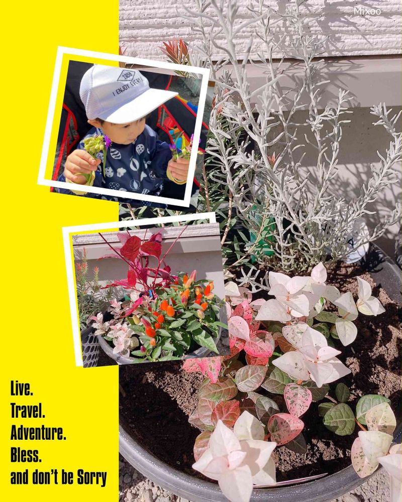 寄せ植えした花達🌷🌸🌺🌻と共にすくすくと育って3歳まであっという間…