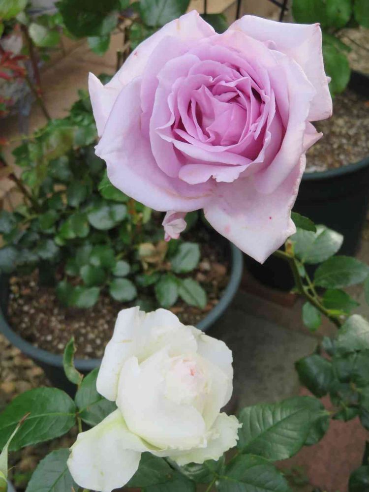 バラのブルームーンとボレロが、咲きました🌼🍀色も香りも、いいです😉✨💖ブルームーンは、私の一番好きな薔薇です🎵今年は、よく咲いてくれました💜💜💖もうひとつ蕾があるので、がんばれ〰️👊😆🎵