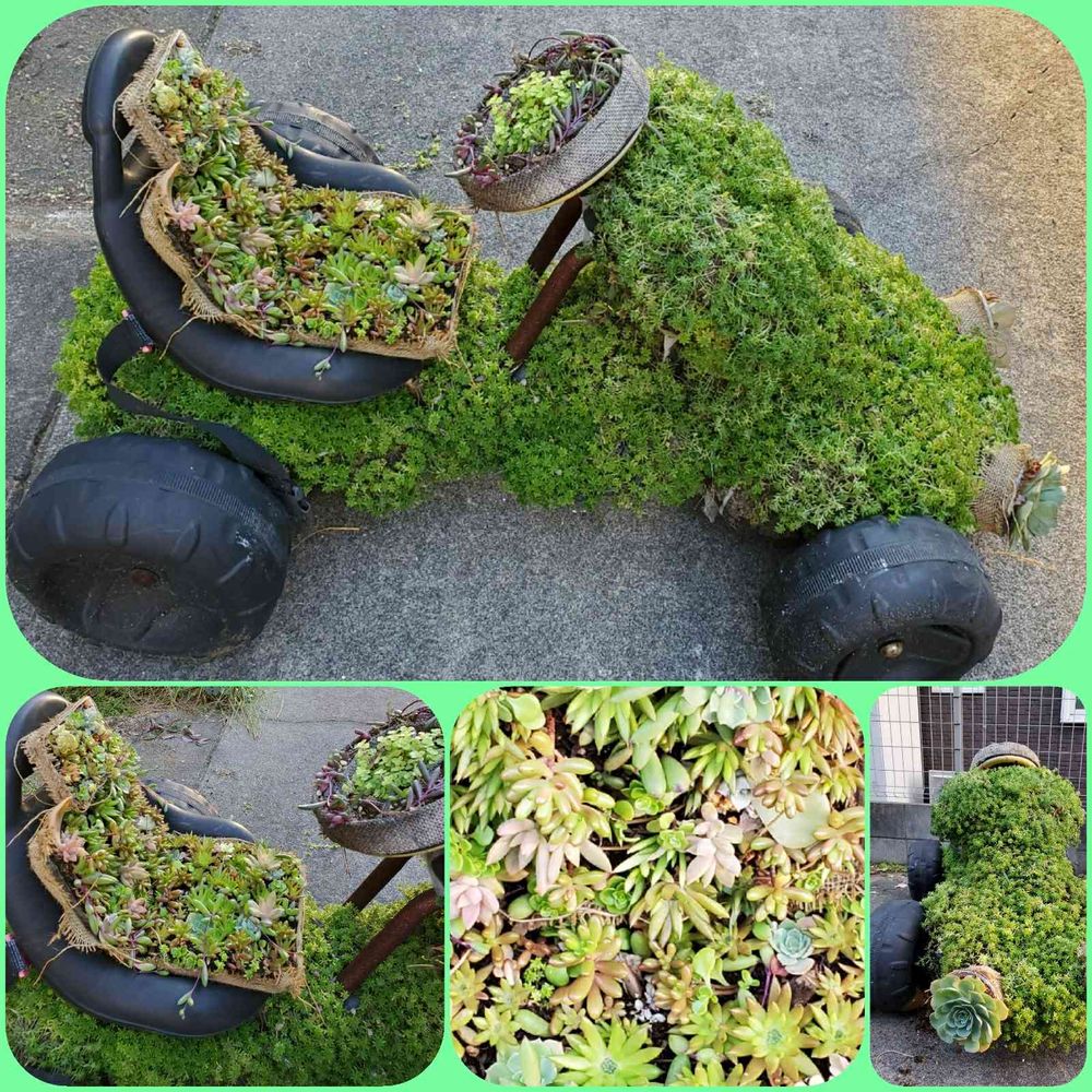 最初は、外で鉢置きにしていたのですが、モリムラ年草を這わせて多肉🚗に……