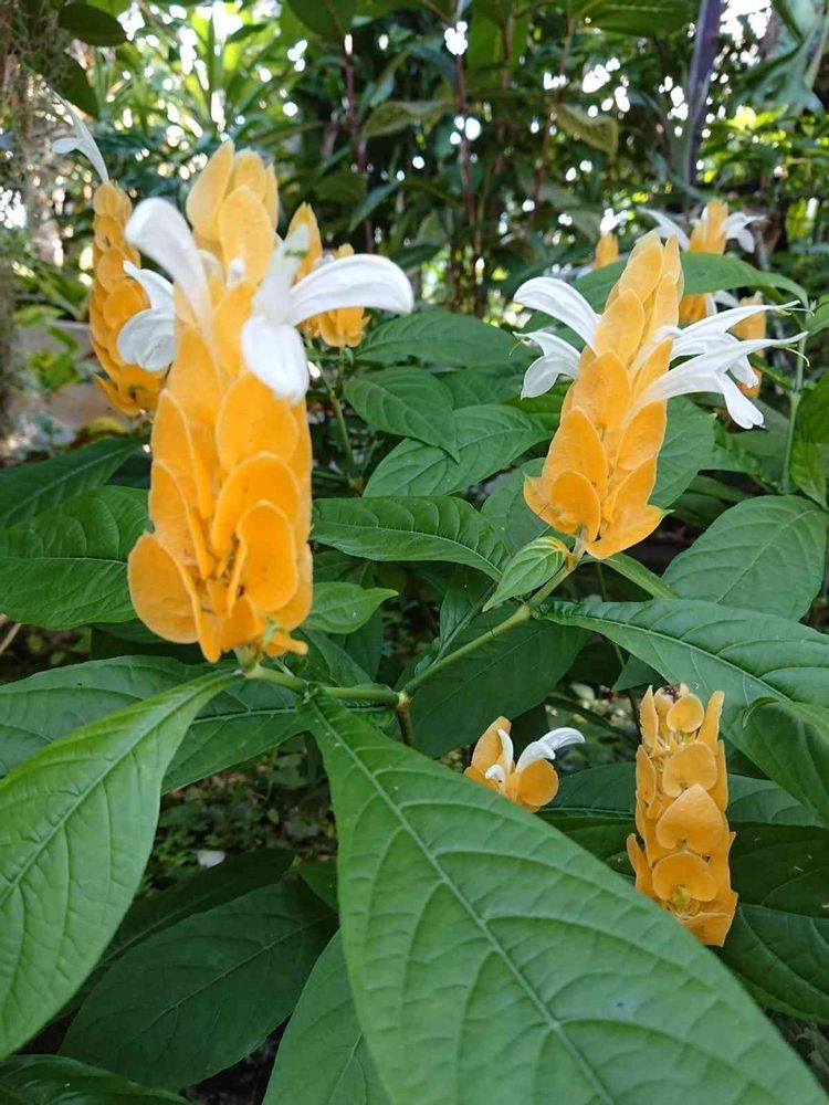 茎の先に花穂をつけて苞(黄色い部分)から出る白色の花は目立たず短命ですが 美しい黄色の苞は長期間残るそうです💛