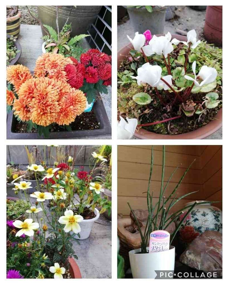 左上から モコモコになっていた カクテルマム シクラメン 冬コスモス 玄関の中の 細めのサンスベリア♪