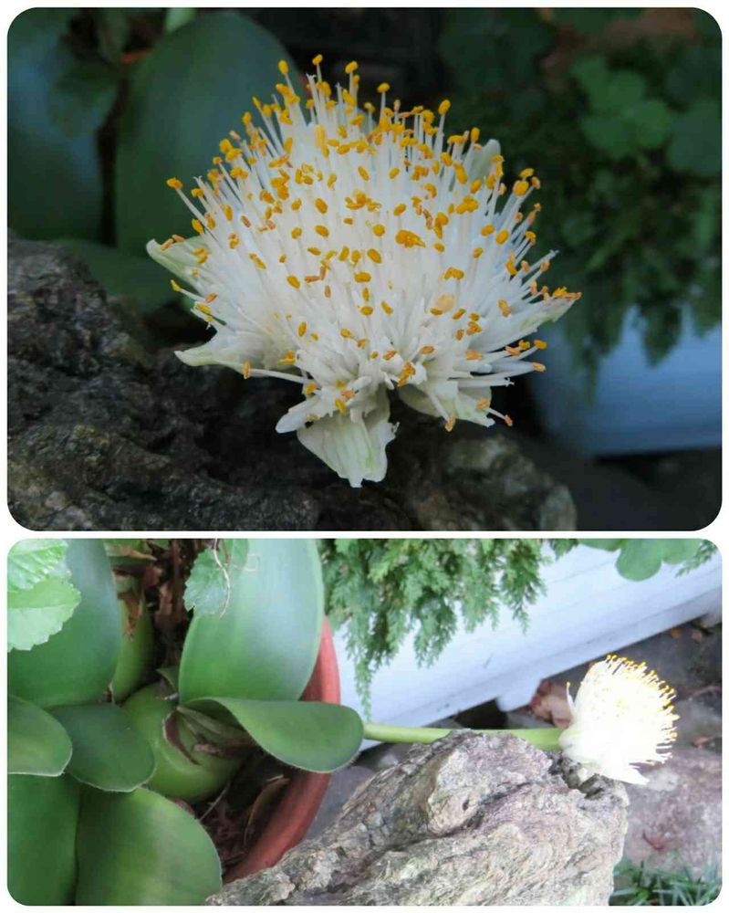 マユハケオモト(眉刷毛万年青)は南アフリカ原産のヒガンバナ科ハエマンサス属の宿根草。花が眉刷毛を連想するところから、また葉がオモト(万年青)に似ているところからこの名前が付いた。別名ハエマンサス・アルビフロス。花期10~11月。刷毛(はけ)のようなフサフサの花で、葉は多肉質で厚い。