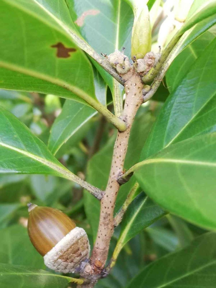 ドングリは2年かけて生長します。画像の枝先の冬芽の付け根に、今年開花した未熟な果実があります。来年生長し、来年秋にドングリとなります。
