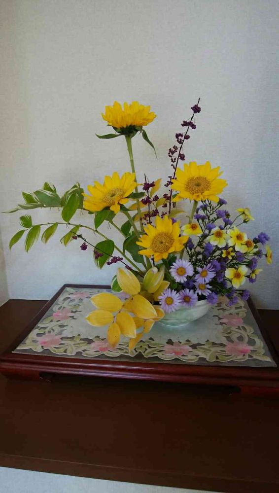 さん😌ありがとうございます😊いただいた向日葵🌻4本全部使ってしまいました😂自分自身でも違和感ありました😂やはり基本的にはメインの花は奇数が良いのですね😌勉強になりました😄