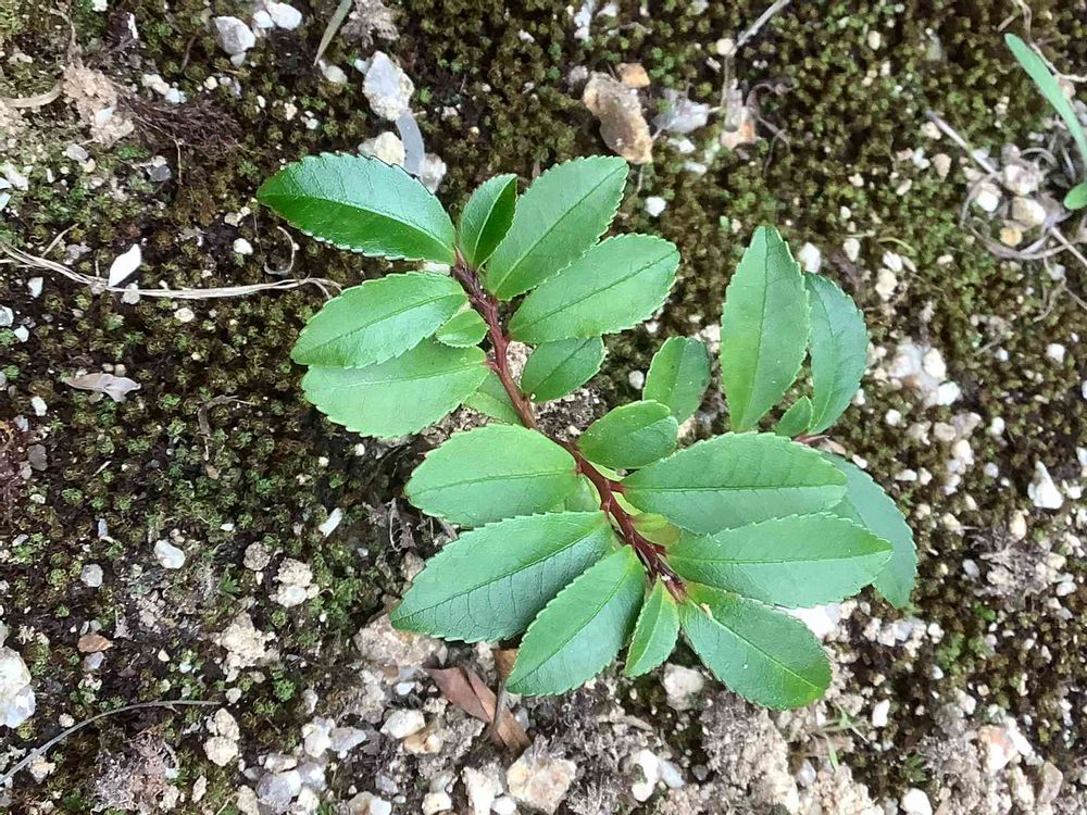枝の色と葉っぱの形が特徴的なので、サザンカかセンリョウではないかと思いました!