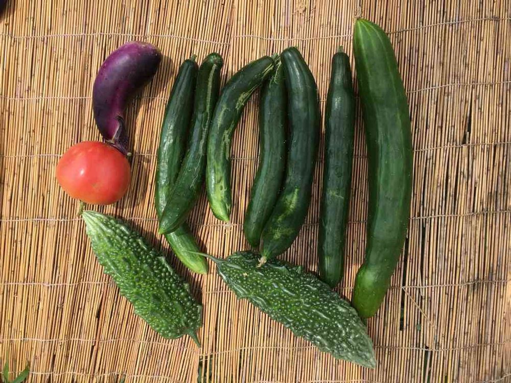 キュウリ7本、うち1本37センチ。ゴーヤ2、ナス1、トマト1。