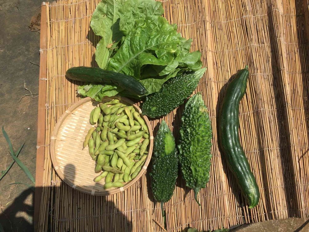キュウリ2本、ゴーヤ2本、チマサンチュ、ここにはありませんが大量。枝豆これで1年分の半分。