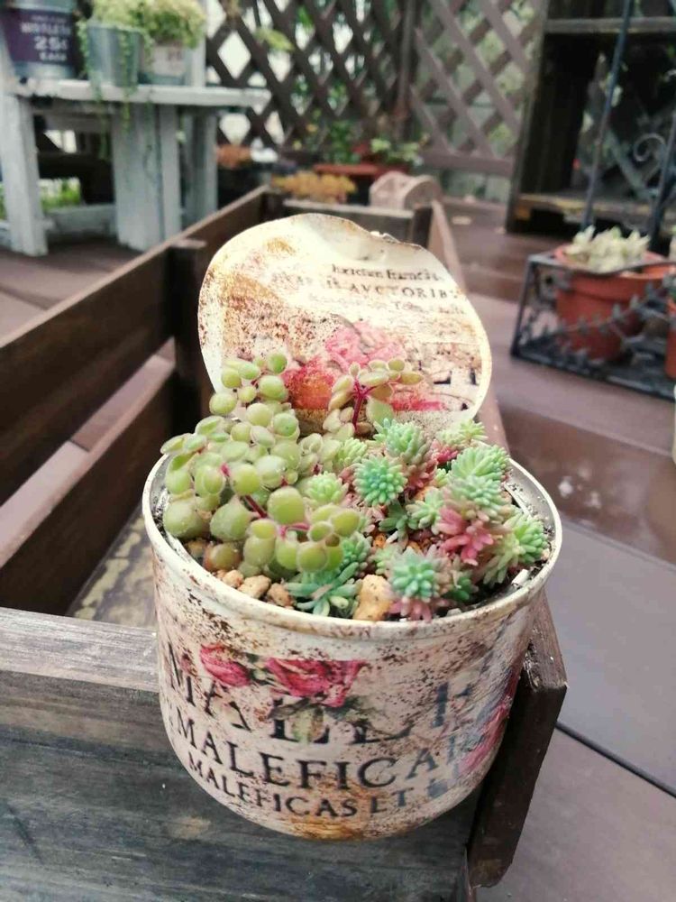 朝から作ったリメ缶に、別の鉢で徒長してたセダム達を寄せてみた。