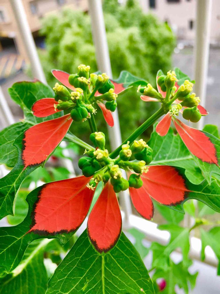 先月投稿したときより ポインセチアっぽく鮮やか❤️カボチャみたいな種?いっぱいぶら下げてます