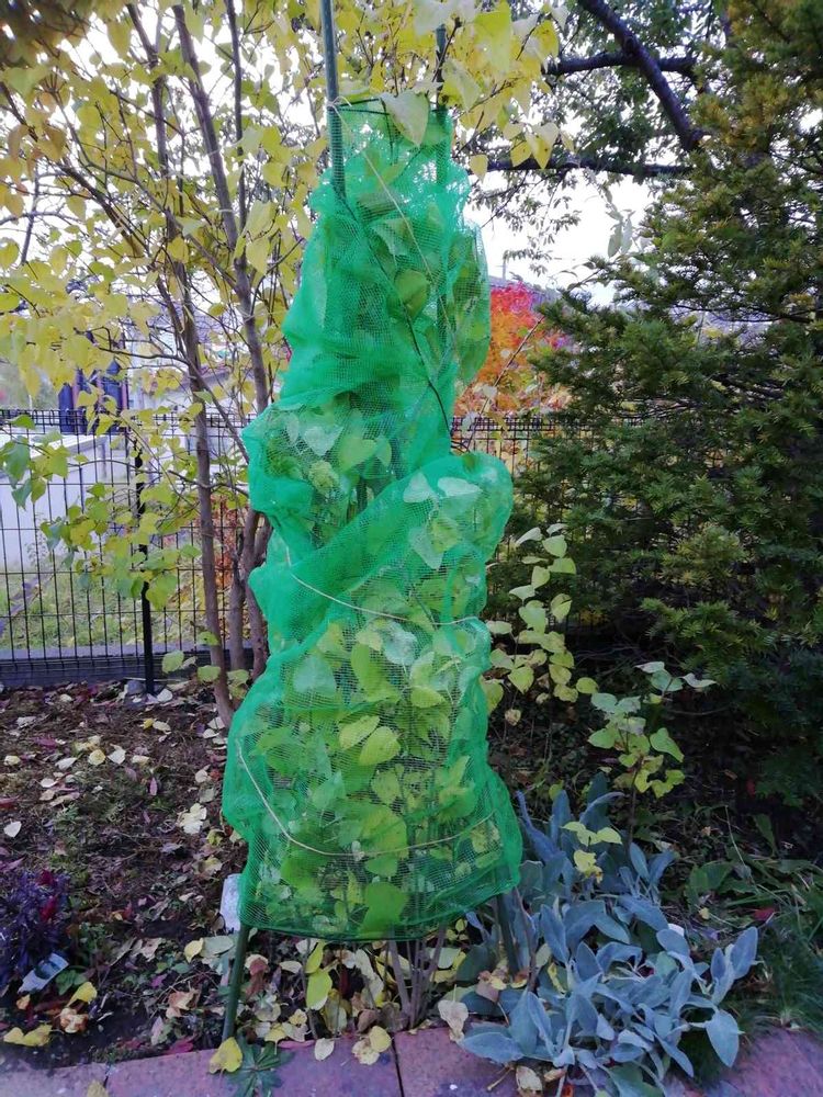 夏に花を支えていた支柱を3本ハンマー🔨で叩いて地面に差して、先端部分でまとめ縛り、網かコモ(ムシロ)を被せて紐で縛ります。