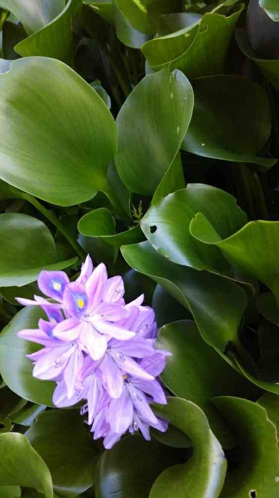 お隣のお家の2メートル四方の池に根っ子が土に埋まってる状態のホテイソウ