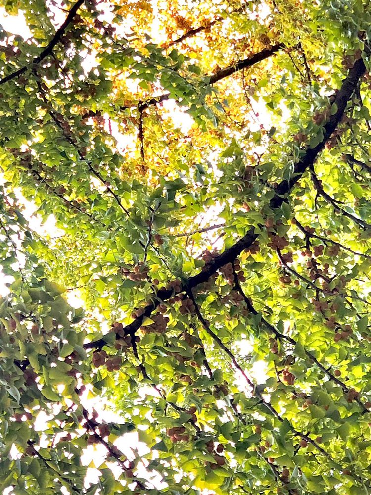 イチョウの木の下に入って見上げると、こんな感じに実がよく見えました🟡✨