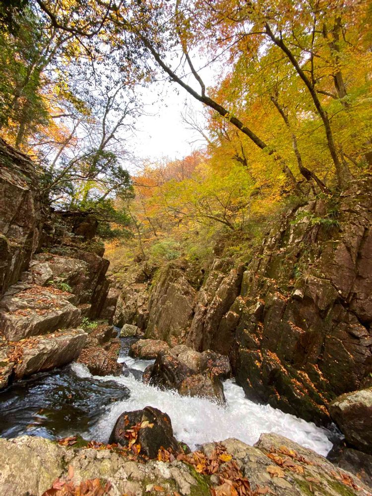 三段峡も縦長なので、花の咲く時期や紅葉する時期が少しずつ違うんです。今はここの最北区間がとても綺麗で、正面口は色づき始めな様でした。