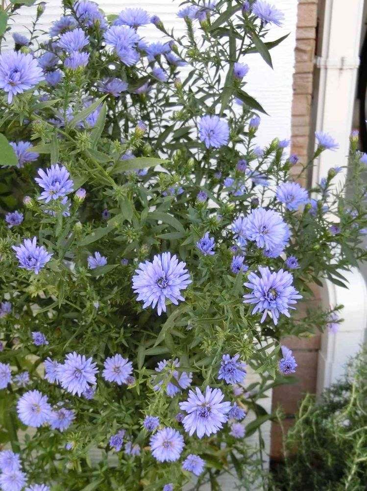 クジャクアスターは元々白い花のみでしたが、ユウゼンギク(友禅菊)との交配で花色が多様化しピンク・紫・青・藤色などが生まれています。