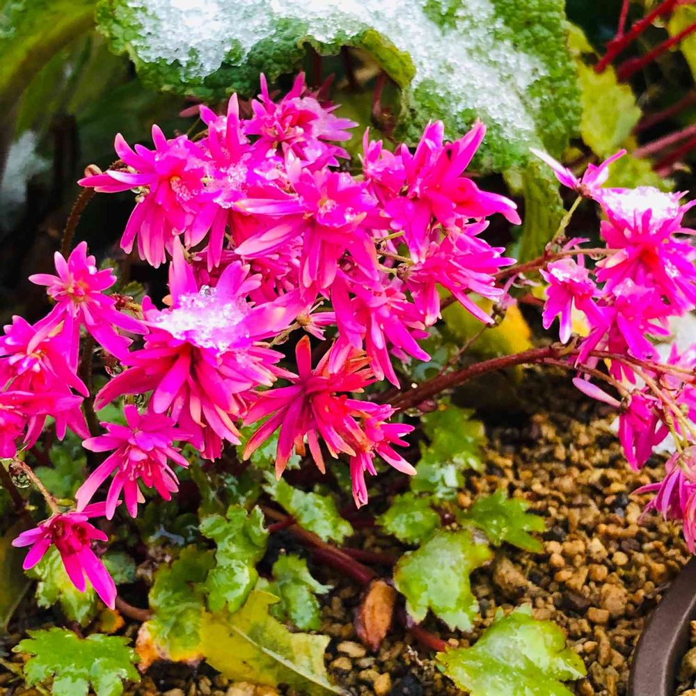 雪のが降ってさらにピンク色のお花が際立って美しいです💖✨❣️