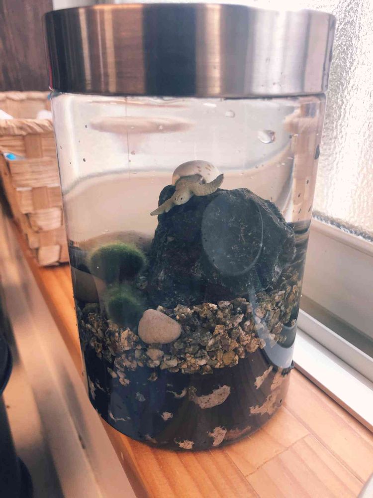 まりも育成用にセリアのビンに、濾過ソイル+底に引く網目のやつ+麦飯石+カメで阿寒湖を再現。阿寒湖の中見たことないけど🤔