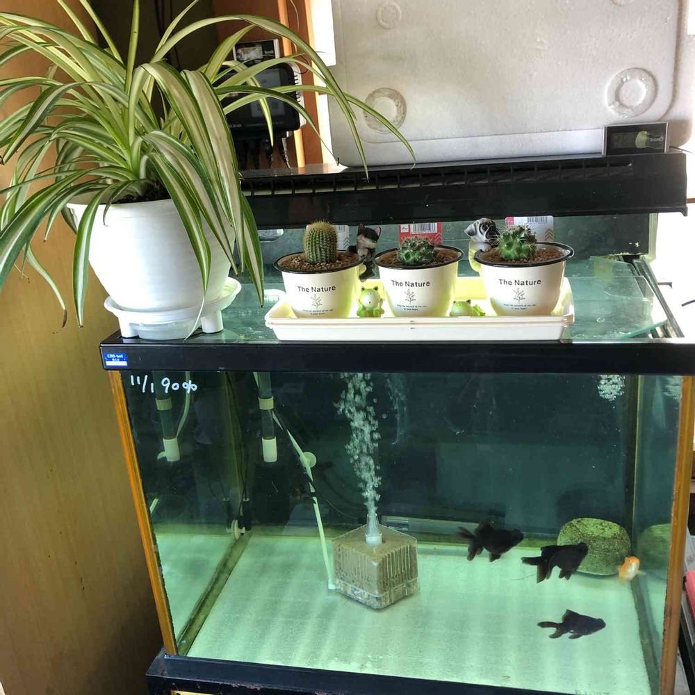 観葉植物の置き場がなくてデメキン水槽の上も植物に侵略され始めた( ੭ ˙࿁˙ )੭ ᐝ